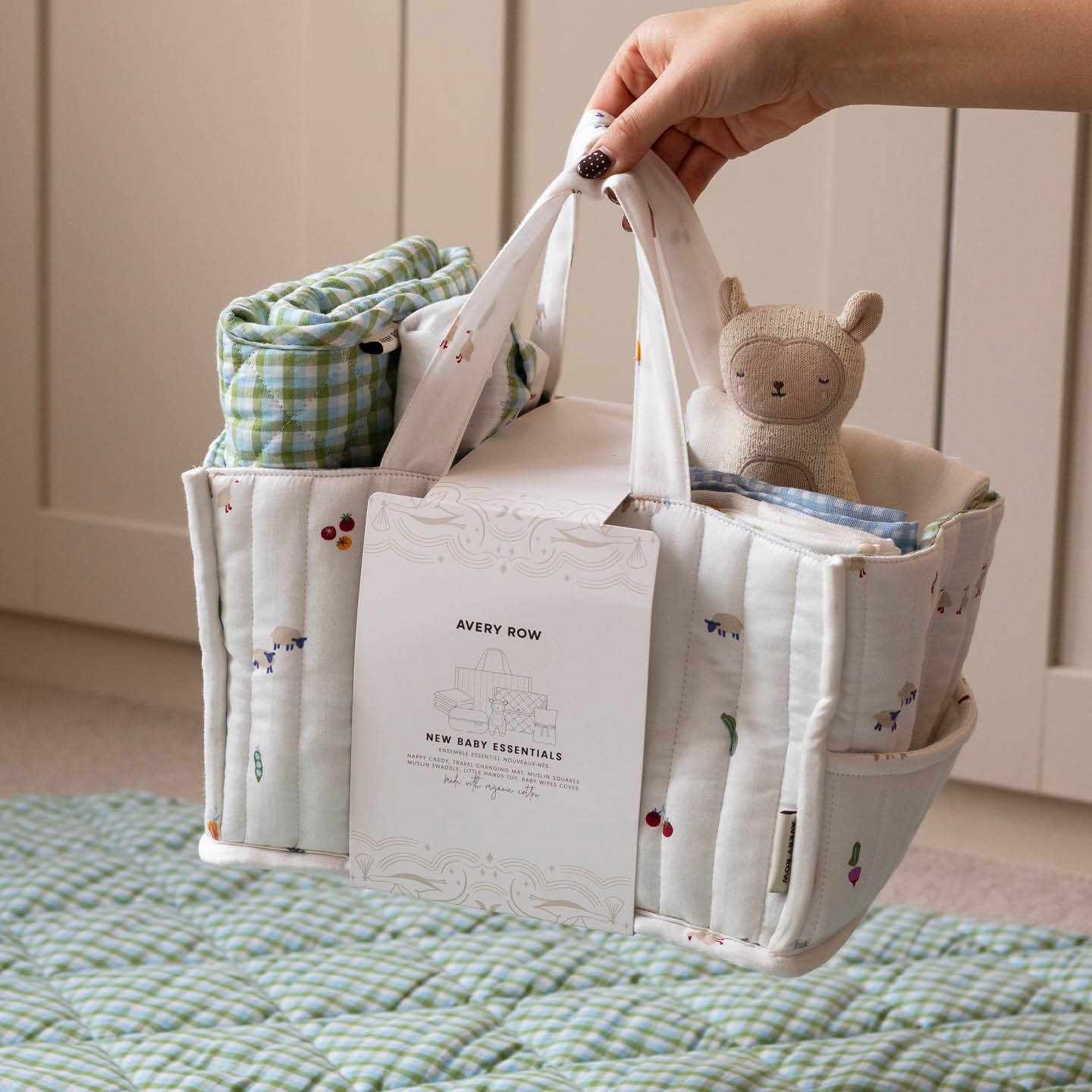 Settið kemur fallega pakkað í notadrjúgan Nappy Caddy – fullkomin gjöf fyrir nýjan fjölskyldumeðlim.